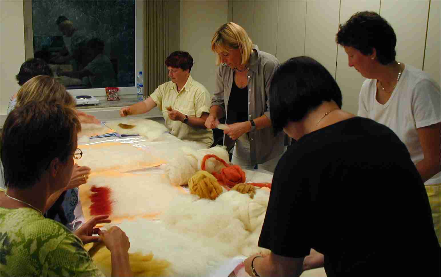 | Am 18. Juni 2002 machten sich 7 Frauen unter Anleitung von Wiebke Kröger mit der Filztechnik vertraut. Im Folgenden wollen wir kurz die Arbeitsschritte skizzieren: |