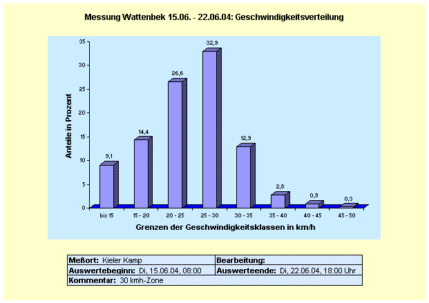 Mit dem Verkehrsmesssystem "viasis" werden Geschwindigkeiten gemessen und dem Fahrer/der Fahrerin direkt angezeigt. Der Hauptzweck der Einrichtung besteht darin, verkehrserziehend zu wirken. Sobald die zulässige Höchstgeschwindigkeit überschritten wird, blinkt die Anzeige. Dieser Hinweis soll bewirken, dass der Fuß vom Gaspedal genommen, bzw. gebremst wird. Auch der Effekt, dass Passanten die Anzeige sehen soll erzieherisch auf Schnellfahrer wirken. Darüber hinaus werden die Messwerte und die Anzahl der Fahrzeuge gespeichert und können ausgewertet werden. Ergebnisse dieser Messungen werden an dieser Stelle regelmäßig veröffentlicht. Die Messeinrichtung ist mobil. Sie kann also auch bei Bedarf an von Bürgern gewünschten Stellen aufgestellt werden. Den Bedarf bitte anmelden beim Bürgermeister, Herrn Uwe Bräse: e-mail: buergermeister@wattenbek.de bzw. Telefon 69 25 85. (Archiv der Verkehrsmessungen: hier) Messungen vom 15.06. bis 22.06.04 im Kieler Kamp: |