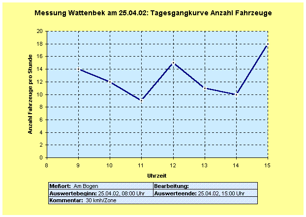 Mit dem Verkehrsmesssystem "viasis" werden Geschwindigkeiten gemessen und dem Fahrer/der Fahrerin direkt angezeigt. Der Hauptzweck der Einrichtung besteht darin, verkehrserziehend zu wirken. Sobald die zulässige Höchstgeschwindigkeit überschritten wird, blinkt die Anzeige. Dieser Hinweis soll bewirken, dass der Fuß vom Gaspedal genommen, bzw. gebremst wird. Auch der Effekt, dass Passanten die Anzeige sehen soll erzieherisch auf Schnellfahrer wirken. Darüber hinaus werden die Messwerte und die Anzahl der Fahrzeuge gespeichert und können ausgewertet werden. Ergebnisse dieser Messungen werden an dieser Stelle regelmäßig veröffentlicht. Die Messeinrichtung ist mobil. Sie kann also auch bei Bedarf an von Bürgern gewünschten Stellen aufgestellt werden. Den Bedarf bitte anmelden beim Bürgermeister, Herrn Bernd Voss: e-mail: buergermeister@wattenbek.de bzw. Telefon 69 25 85. Messung v. 24.04.2002 (Am Bogen, 30 km/h - Zone): |